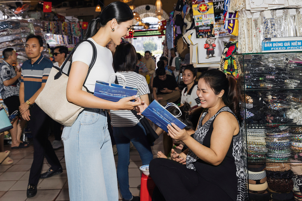 Các nàng hậu xuất hiện trong trang phục lịch sự, năng động, thân thiện giao lưu, chụp ảnh và tận tay gửi tặng túi đến các tiểu thương, người dân và du khách.